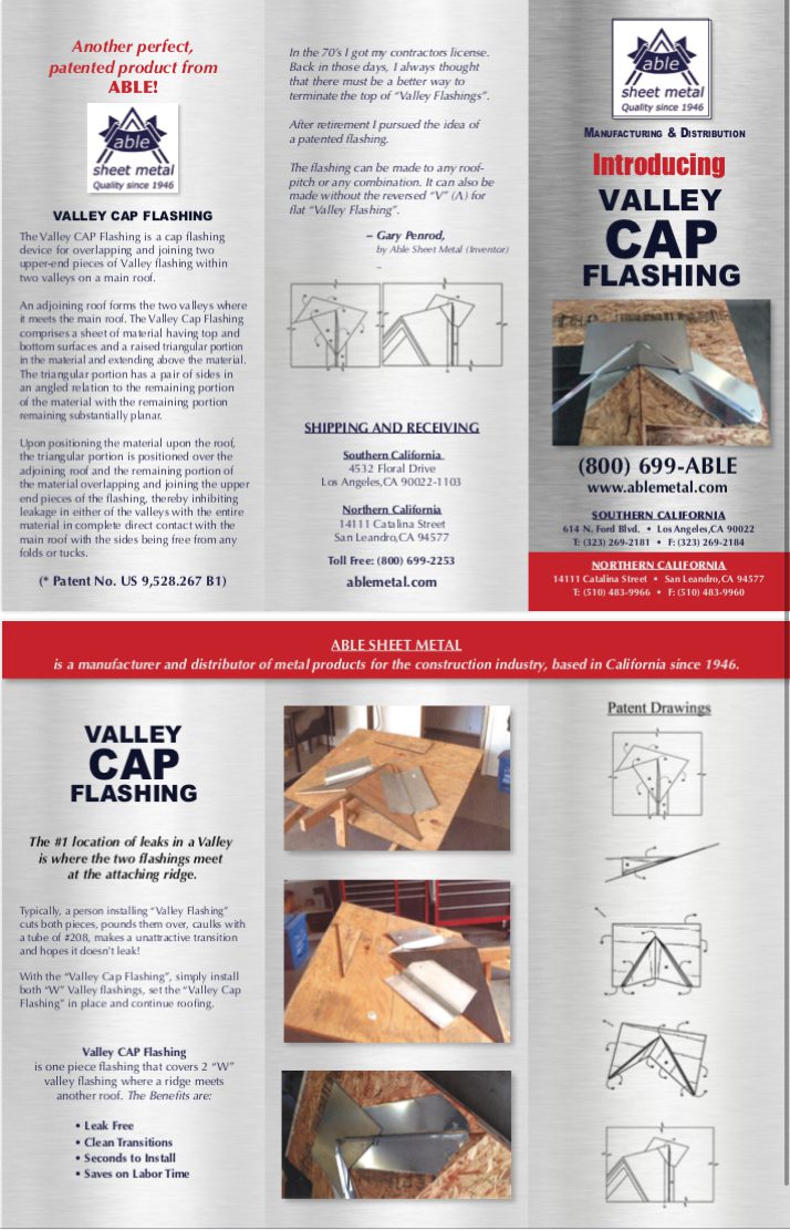 Products Main / Our Patented and Innovative Products / W-Valley Cap Flashing W-Valley Cap Flashing Options * Mode 1Mode 2 This product is currently out of stock and unavailable. Description The Valley CAP Flashing is a cap flashing device for overlapping and joining two upper-end pieces of Valley flashing within two valleys on a main roof. Customer provides the pitch of the roof when ordering because every roof is different.