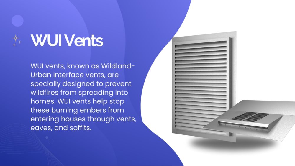 WUI vents are special vents designed to prevent elements of wildfires from spreading into homes. According to wildfire experts at the Insurance Institute for Business & Home Safety (IBHS), windblown embers are a major cause of homes catching fire during wildfires. WUI vents help stop these burning embers from entering houses through vents, eaves, and soffits.